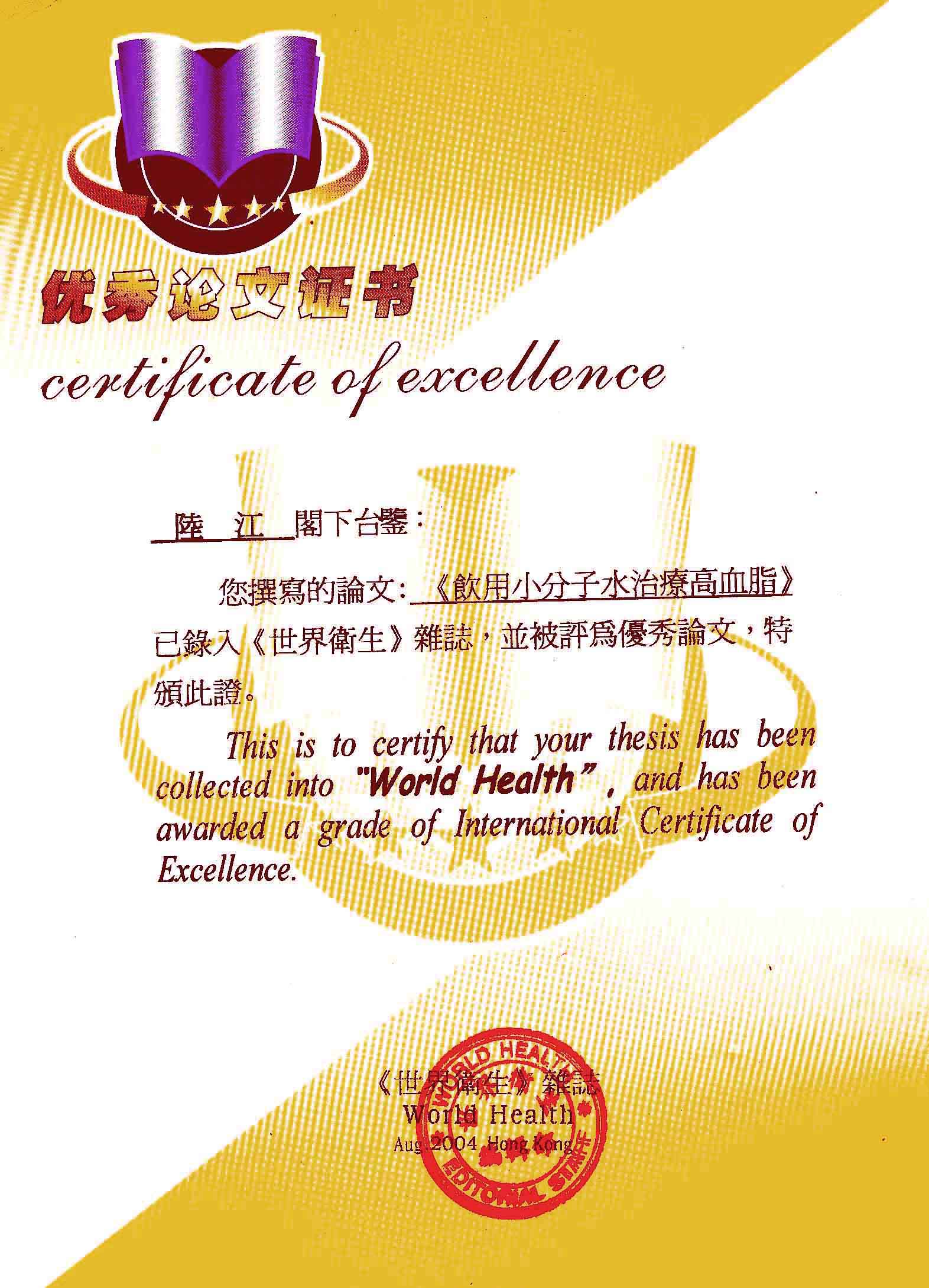 一.發明的亮點是中國基礎醫學研究成果的轉化醫學應用------------------------------------------------------------------------------------ 1990年春,我50歲,發現患了高血壓,便及時遵醫囑服藥。我想起父輩、祖輩曾患高血壓,后來都患中風癱瘓或心梗過世,所以心中壓力大。我夢想能根治高血壓,便研究醫學。當我檢索到中國基礎醫學研究成果,采用高脂餐和磁處理小分子團水飼喂小白鼠或大白免等兩組哺乳動物,經過2、4、6個月剖殺血檢,發現飼喂小分子團水的試驗組動脈內壁干凈,能減輕和延緩動脈粥樣硬化。我從這些研究成果受到啟發。覺得有責任研制出優良的器具,讓天下人能真正治愈高血壓,消除動脈粥樣硬化,延年益壽。于是,1990年我做成樣品,先后與愛人飲用兩三個月,分別治愈了高、低血壓,之后我們的血壓都正常,癥狀消失。該水經南京大學做核磁共振檢測為55.82赫茲的微小分子團水。該品經工業開發后,1994年送給廣西三家三甲醫院做臨床試用4個月,再經北京和廣西醫學專家鑒定認為:“降脂降壓效果好” ,“能擴大心腦動脈流量,改善心腦電圖和微循環” ,“對治療心腦動脈粥樣硬化、高血壓、高血脂有良好的醫療保健作用”。1996年產品獲得中國發明專利權。這就使產品可以轉化為醫學應用,人類可逐漸改變終生服藥,自己祛除病癥。