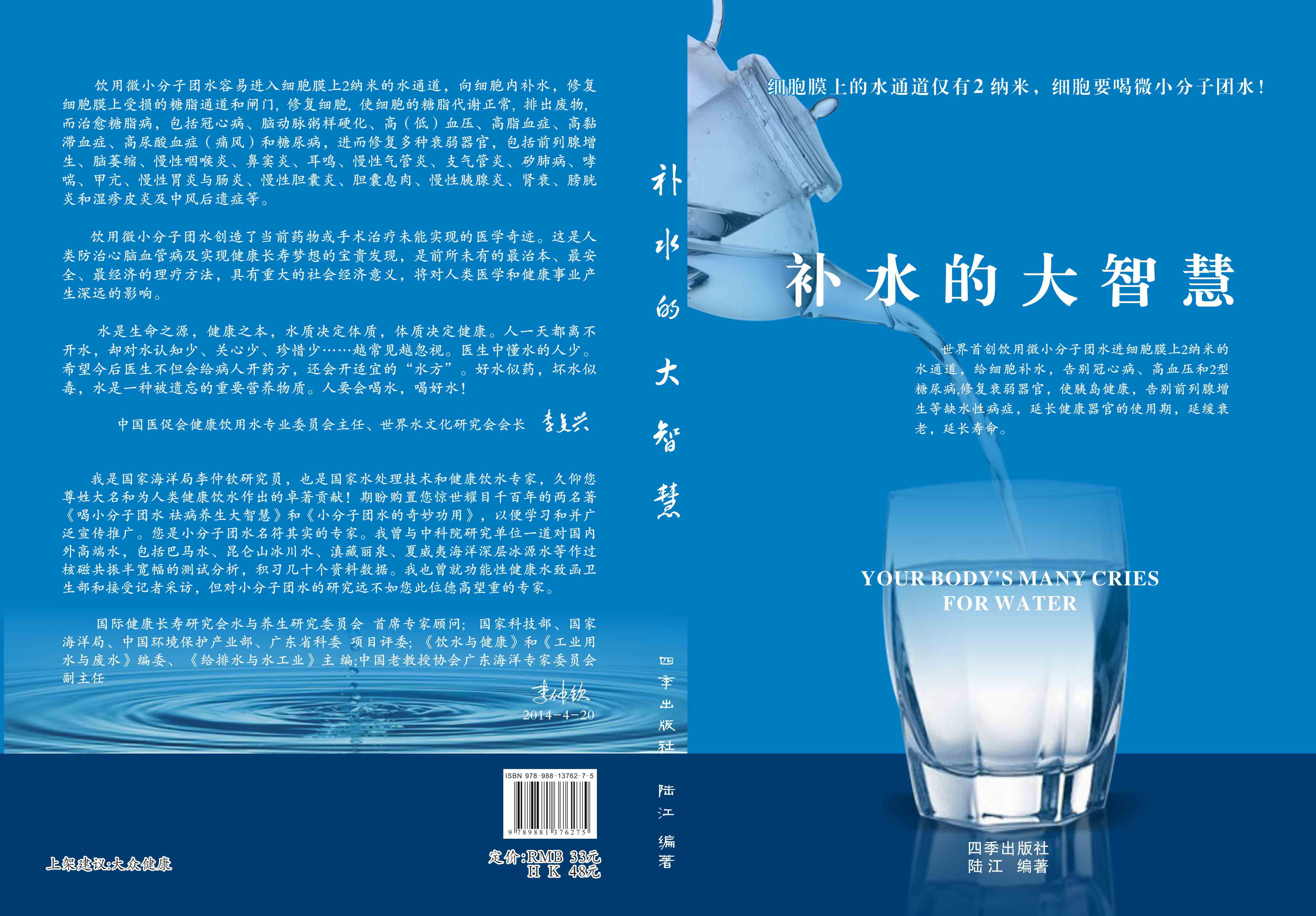 ----幾千年來,人們感到口渴才喝水,誤認為口渴是唯一的缺水信號,使喝水量偏少。很多人只知道補血補氣補腎補鈣補硒,而不知補水,逐漸使許多器官缺水,包括皮膚、動脈、氣管、膽囊、腸胃、骨關節、腎臟、前列腺和胰島缺水,以致患冠心病、高(低)血壓和糖尿病等缺水性病癥。美國F·巴特曼醫學博士寫有《水是最好的藥》一書很受歡迎,我國2007年譯成中文版,論述人體缺水引起許多病癥,他指導3000多患者喝水治愈了哮喘、胃炎和高血壓等病癥。而我是從2000年起,讓患者飲用微小分子團水,因為容易進細胞膜上2納米的水通道,治愈了許多缺水性的病。我跟蹤調查14年,發現凡是認真飲用和合理膳食,可治愈冠心病、高(低)血壓和2型糖尿病與衰弱器官并發癥及中風后遺癥。高血壓患者飲用2~5個月,癥狀消除,不再服藥,逐漸逆轉至消除動脈粥樣硬化,血壓正常穩定,治愈了高血壓;冠心病人飲用3~5個月,消除心絞痛、房顫等癥狀,不再服藥,一年左右心電圖正常,經冠狀動脈造影掃描表明冠脈內無粥樣斑塊,真正治愈了冠心??;2型糖尿病人飲用3~10個月停藥,血糖尿糖正常,糖尿病痊愈。并且使前列腺增生、慢性咽喉炎、鼻竇炎、耳鳴、慢性氣管炎、支氣管炎、哮喘、矽肺病、慢性胃腸炎、膽囊炎、胰腺炎、腎衰、膀胱炎、風濕性關節炎、便秘、痔瘡和濕疹皮炎等不藥而愈,而無需終生服藥。飲用微小分子團水治愈的是長期吃藥治不好的病,彌補了幾千年來醫藥的欠缺,成為人類健康的寶貴資源。