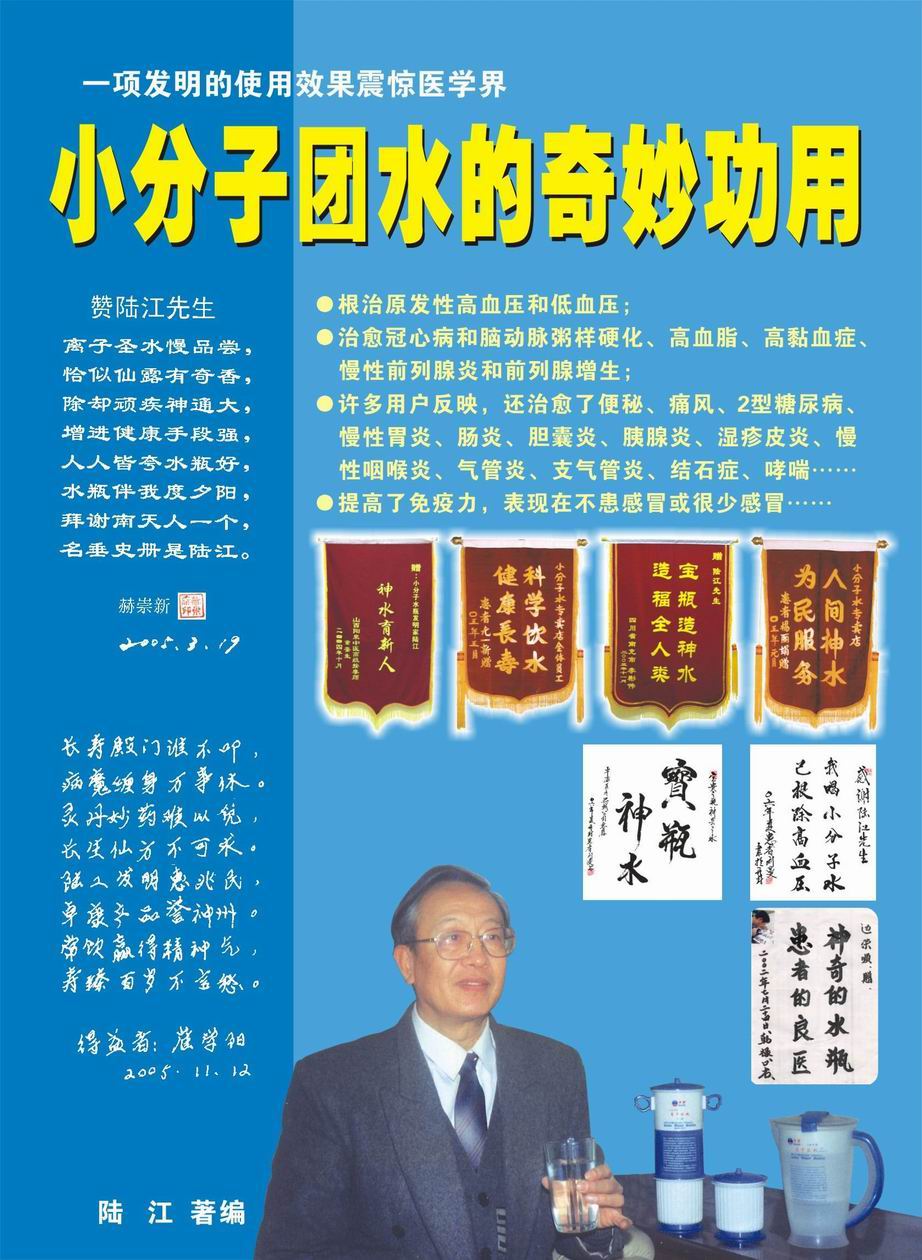 人類幾千年來患以上病癥需終生服藥,幾十年也不能治愈??墒俏覈蠈幍母呒壒こ處熽?nbsp;江,于1990年想根治高血壓,研究發明了離子水瓶,處理出微小分子團水供飲用,經過醫院臨床試用和專家鑒定,1999年獲中國發明專利權,產品于2000年投放市場后一直跟蹤調查,據全國各地用戶反饋:祛除了高低血壓、糖尿病和冠心病,并使前列腺增生、咽喉炎、鼻竇炎、慢性氣管炎、支氣管炎、矽肺病、哮喘、慢性胃炎、腸炎、慢性膽囊炎、慢性腎炎、腎衰、膀胱炎、便秘、痔瘡、風濕性關節炎和濕疹皮炎及中風后遺癥等病癥不藥而愈。為什么喝微小水能治20多種???陸 江從1991年德國科學家發現細胞膜水通道僅為2納米獲得啟發,認為多種器官患病是因細胞脫水,不能正常代謝和分裂增殖,才使器官細胞減少致衰弱萎縮而形成細胞缺水性病癥。22年來的實踐有力地支持了“細胞脫水致病”這一重要論點,表明喝微小水可滿足細胞的生理需求,補水就能祛病,是生命科學新亮點。