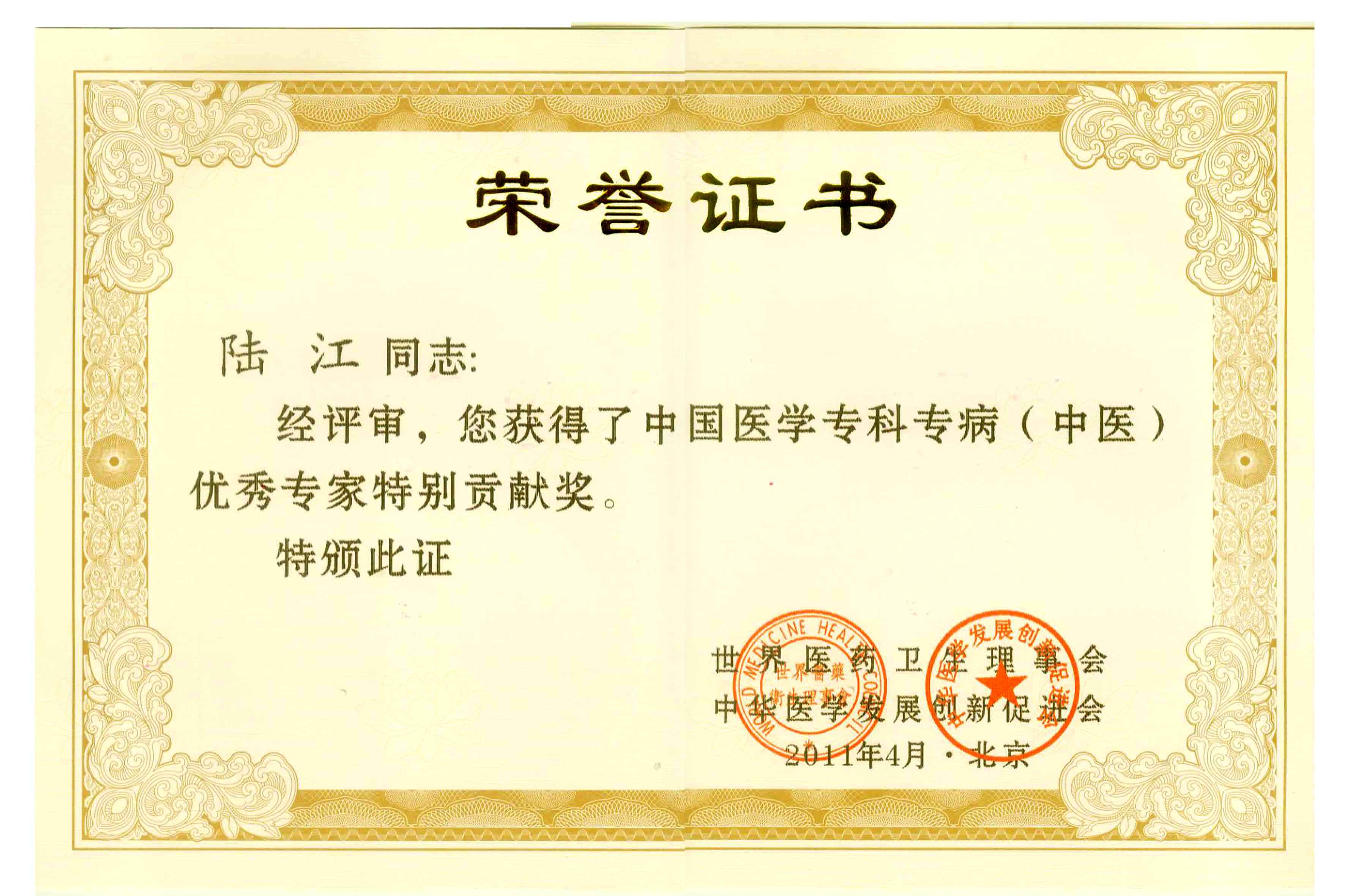 陸江獲得中國醫學??茖2炐銓<沂褎e貢獻獎